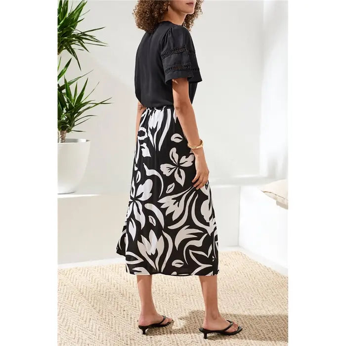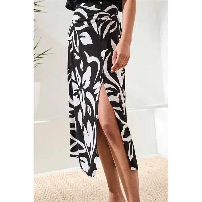 Effortless style meets comfort in this Tribal pull-on wrap front skirt. Crafted from soft rayon, it features a flattering wrap front design and striking black fabric adorned with large white floral print. The elastic waistband ensures a perfect fit without the fuss of zippers or buttons. Ideal for casual outings or relaxed weekend wear, this versatile skirt transitions seamlessly from day to night.