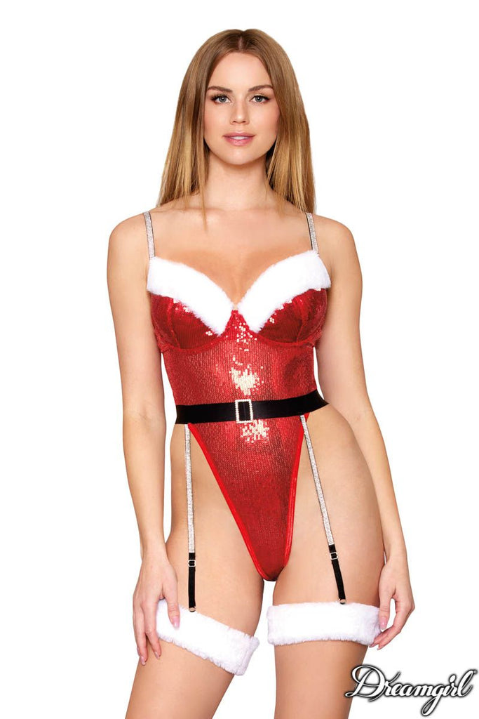 White Teddy with satin and lace details from Dreamgirl. Has attached garter and pearl neck detail that attaches to back.
