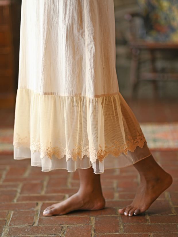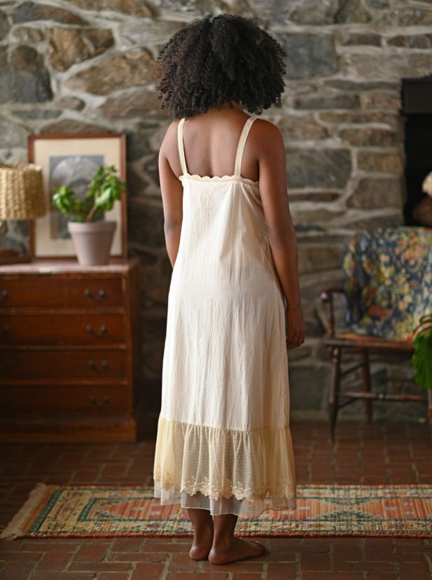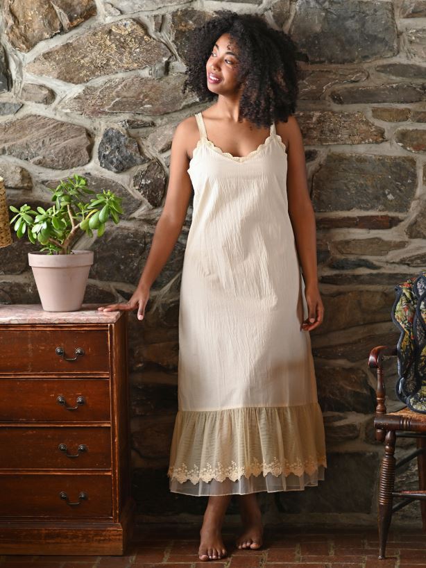 This cotton slip combines softness and delicate style with a flattering fit thanks to darts on the bodice. Featuring lace trim along the neckline and a net flounce hem with lace details, it adds a charming touch. Lightweight nylon net and lace spaghetti straps complete the look. Easy care and proudly made in India, this slip is perfect for everyday comfort with a subtle elegance.