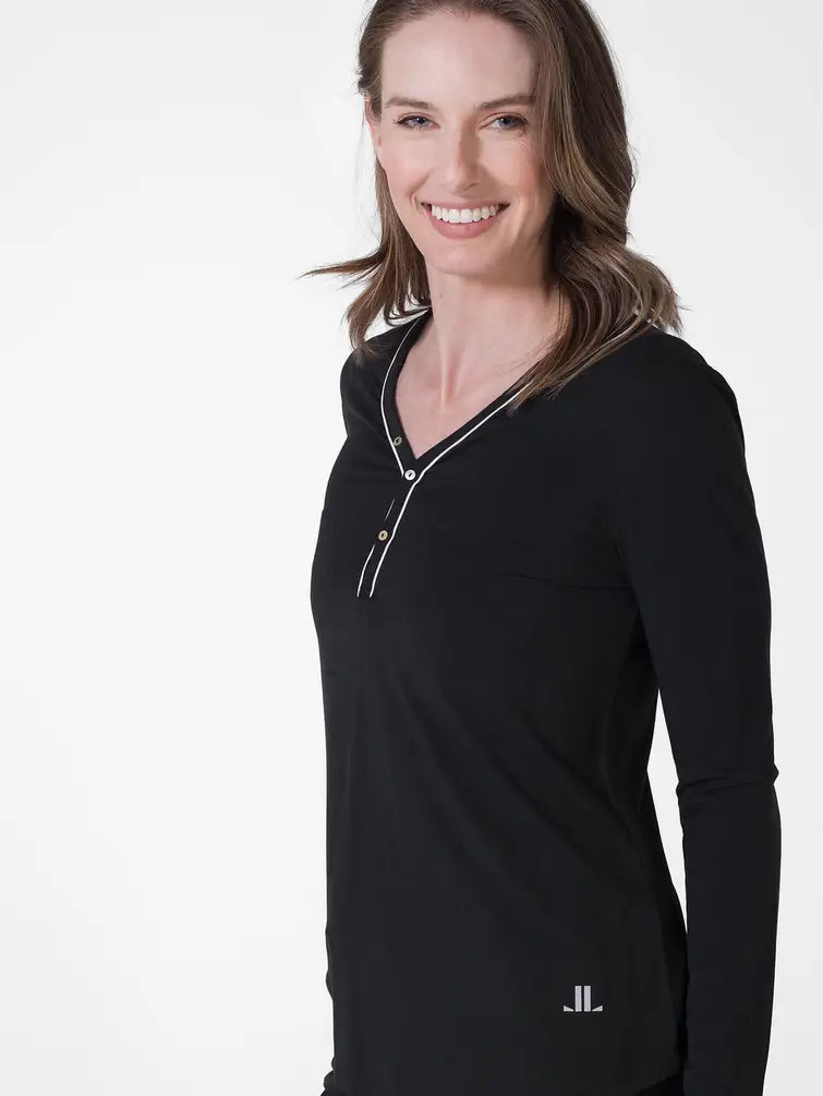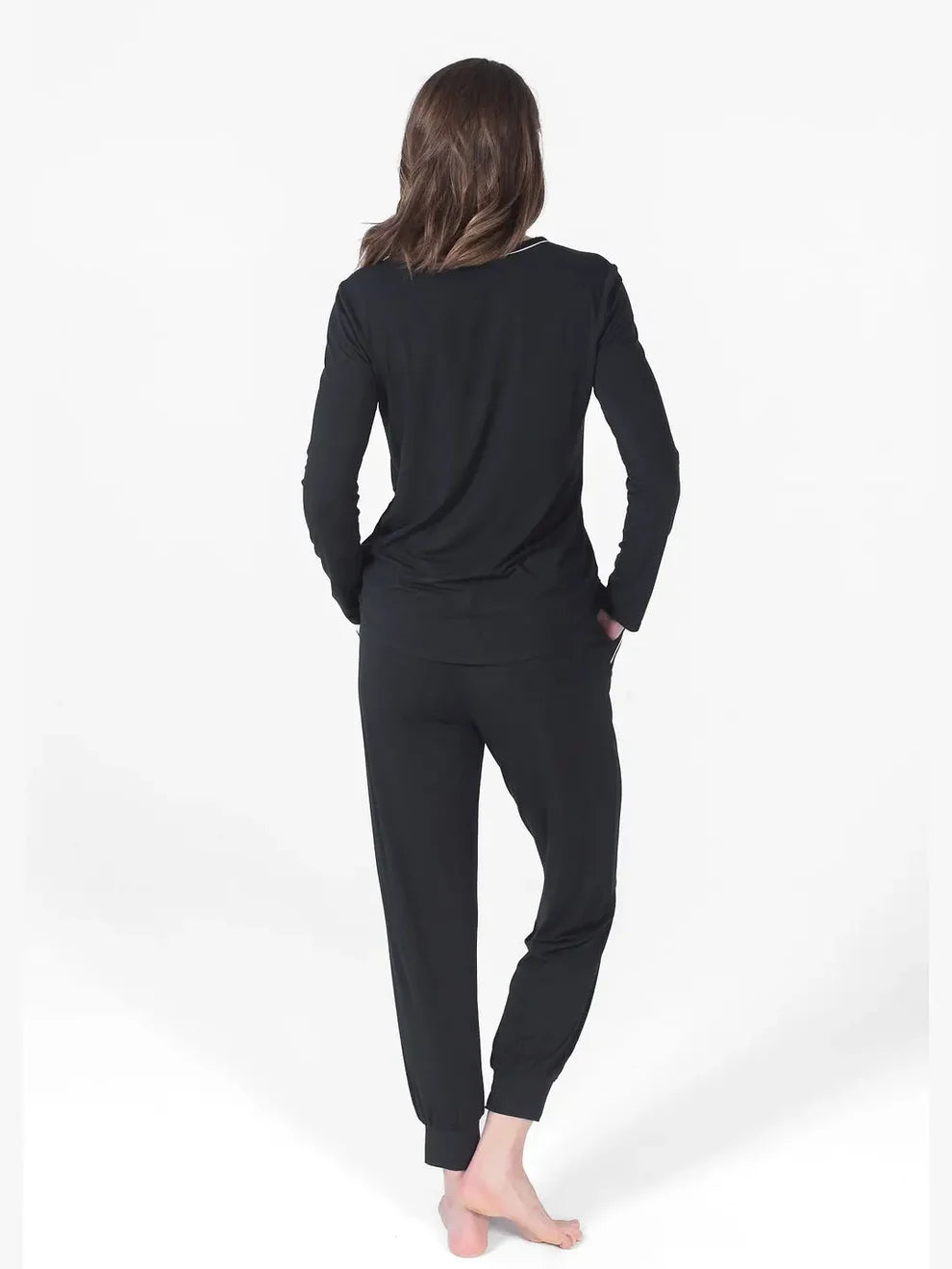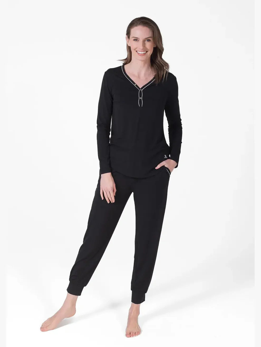 Elevate your downtime with this cozy-chic PJ set. The Henley top, with its shell buttons and contrast piping, pairs perfectly with relaxed joggers designed for comfort and function. From lounging to long nights of rest, this set blends effortless style with everyday ease.