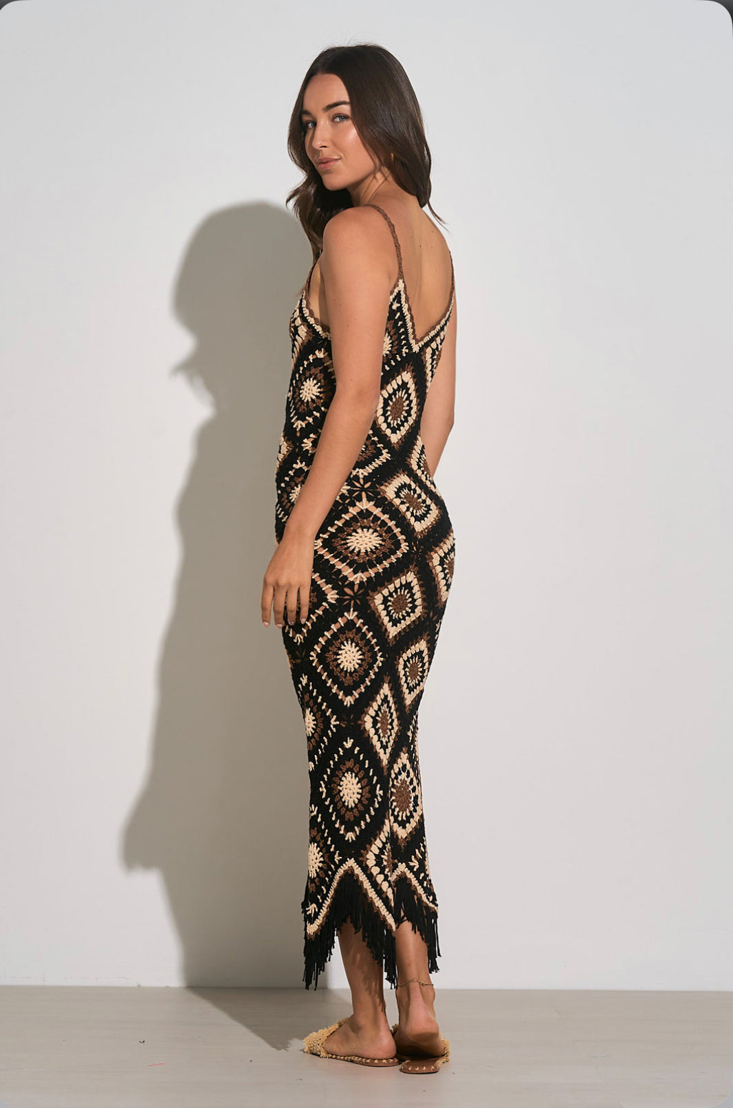 This Elan Crochet Maxi Dress is an elegant, high-quality piece perfect for special occasions. Crafted with love, the soft and beautiful crochet fabric is a combination of black, beige and cream colors. This dress is sure to make a stunning impression at any event.