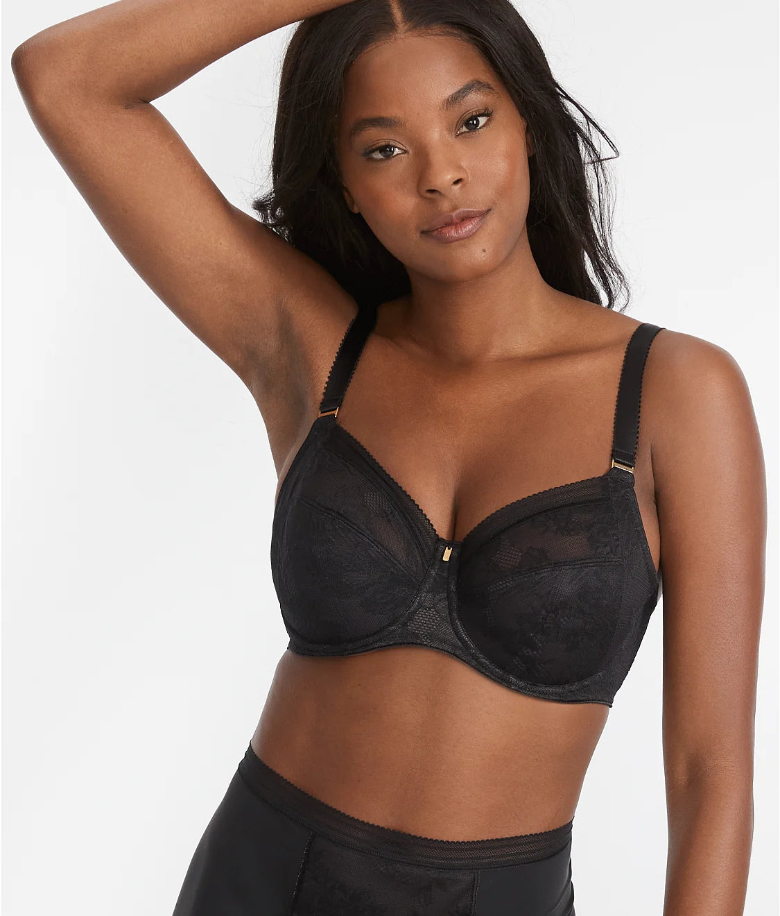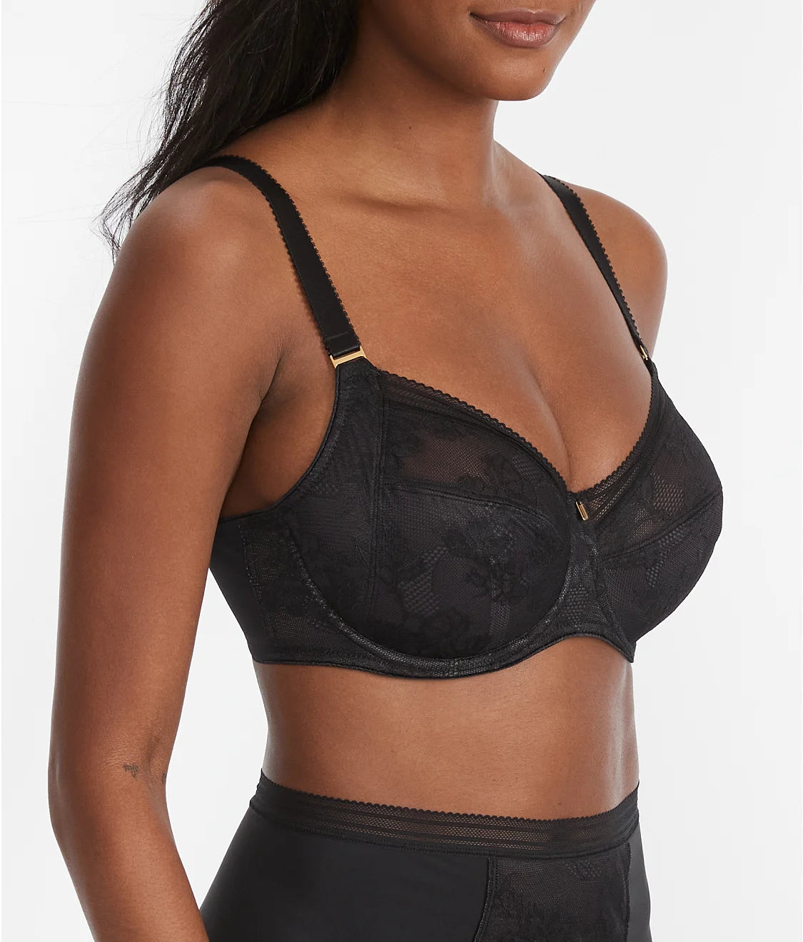- Flat lace adorns cups with elasticated neckline for a custom fit