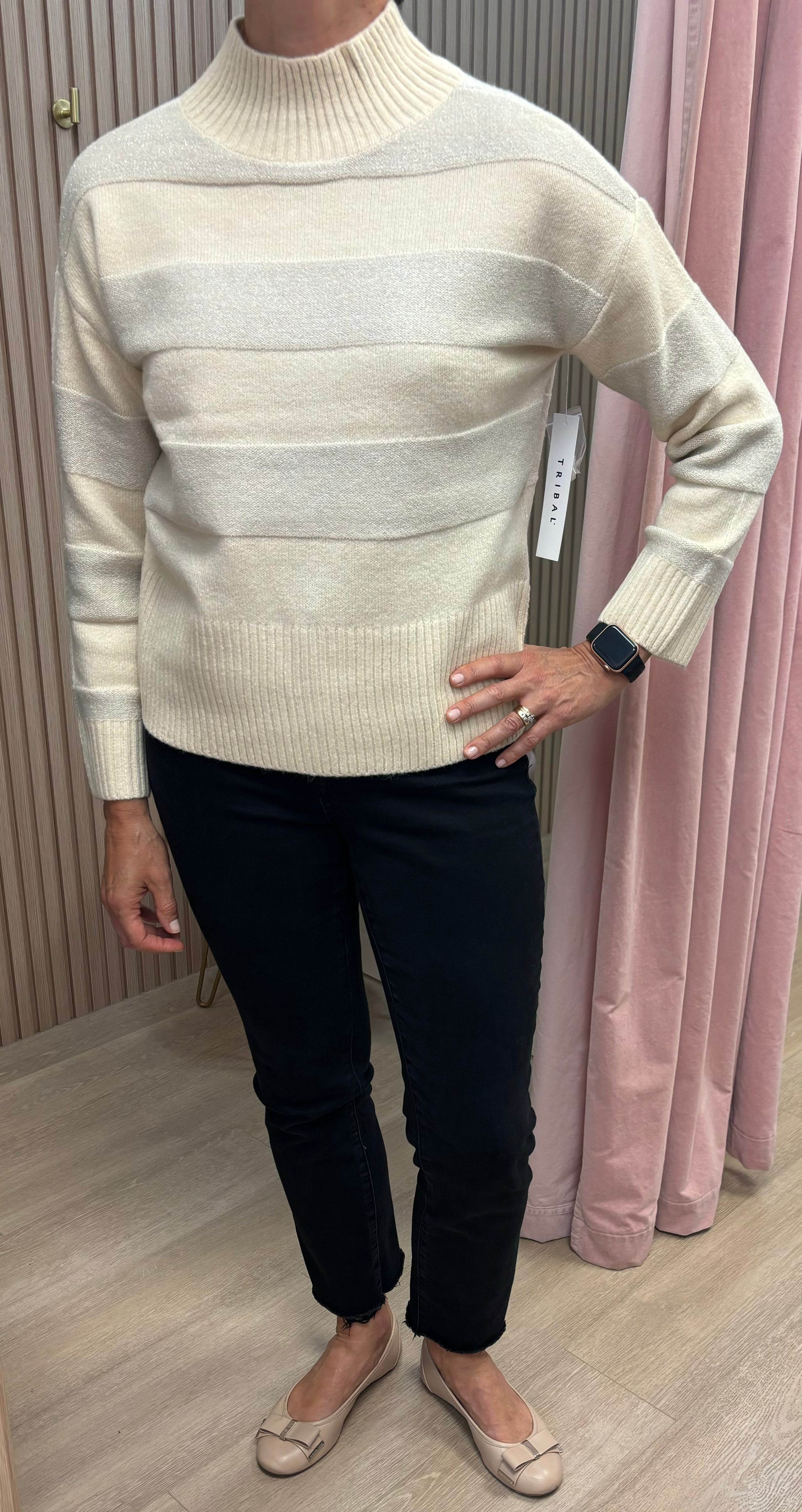 Introducing our Tribal L/S Mock Sleeve in the luxurious Moonstone color. This elegant piece features a soft cream and shimmering silver color palette, perfectly complemented by the 3/4 length sleeve. Embrace sophistication and grace with the subtle glitter stripe detailing. Elevate your wardrobe with this exclusive, must-have item.