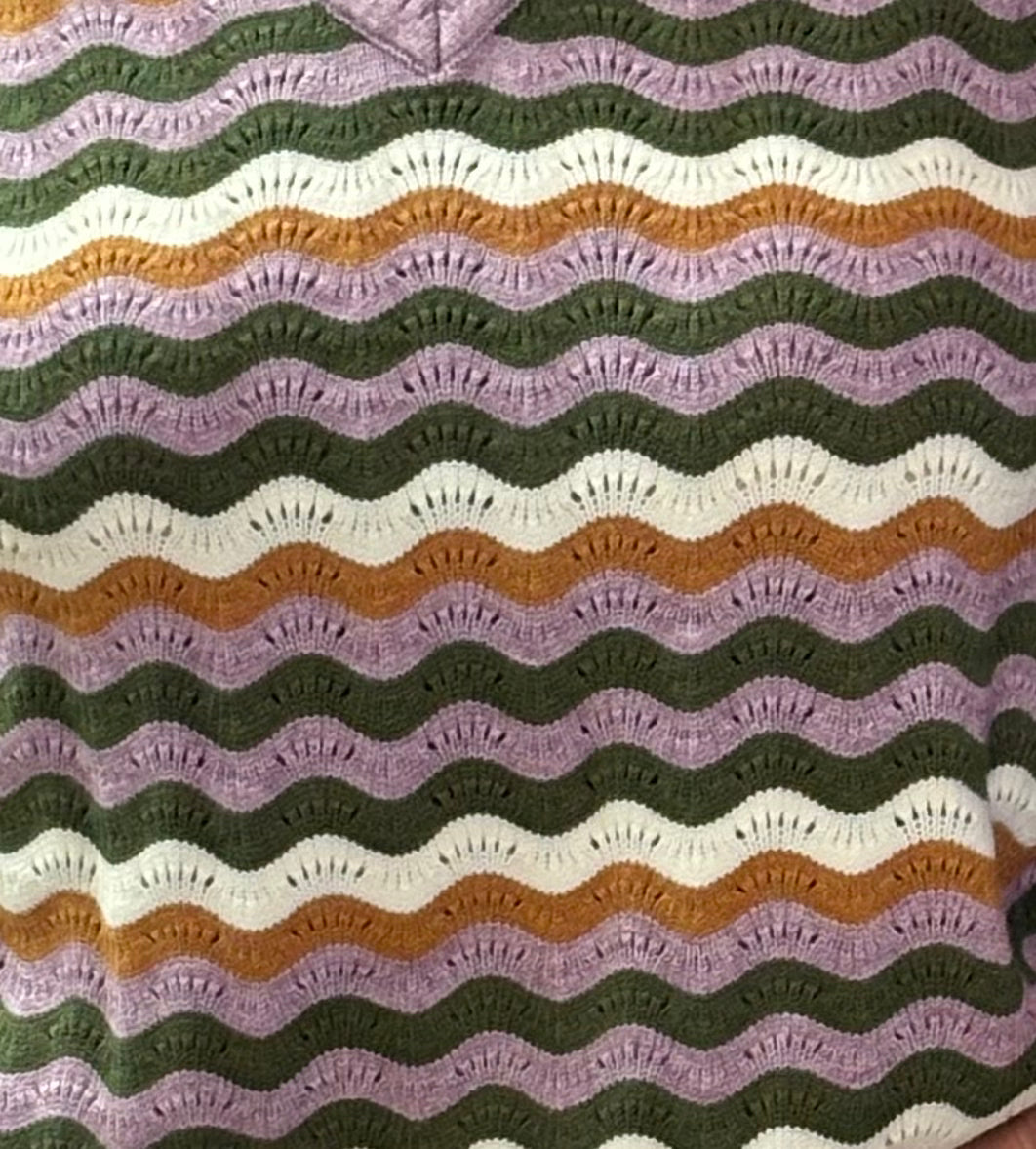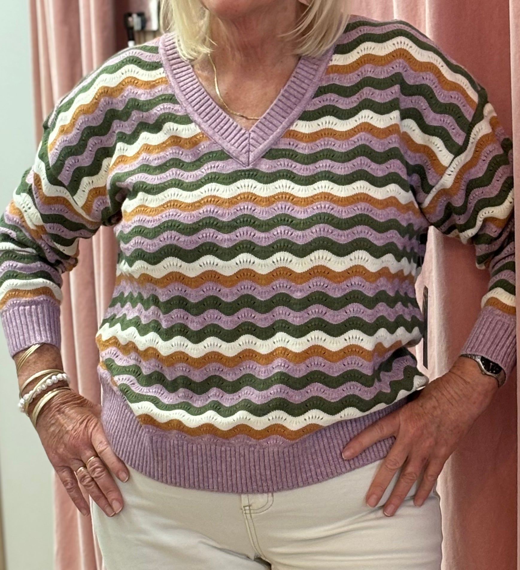 Get cozy and stylish with our Tribal V Neck Knit Sweater! This gorgeous lavender blush, green, rust and ivory wavy stripe design will keep you warm and stylish. Made from buttery soft fabric, it's the perfect addition to your winter wardrobe.