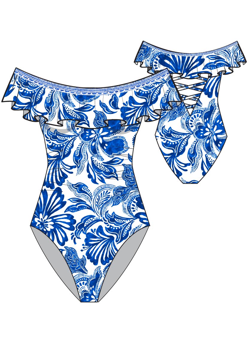 Embrace your inner island goddess in this stunning La Blanca off-the-shoulder ruffle swimsuit. Romantic ruffles frame the collarbone beautifully while the ruched front flatters your silhouette. The tie-up back detail adds a cheeky touch of elegance, making this botanical brocade design perfect for turning heads at the beach or pool. Effortlessly sophisticated and undeniably fun.