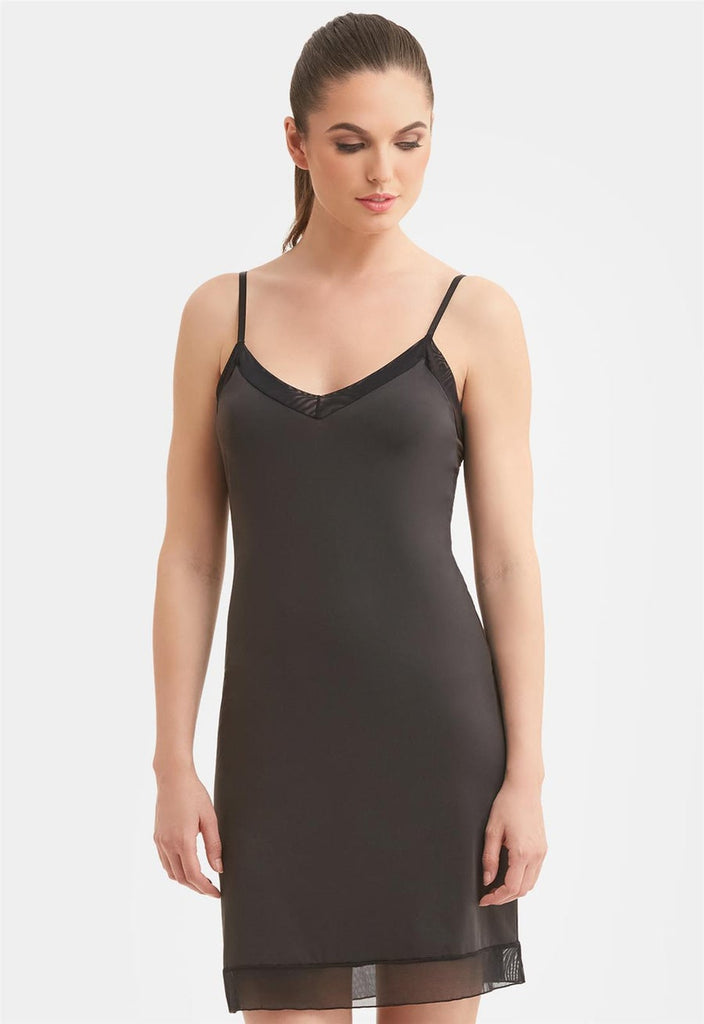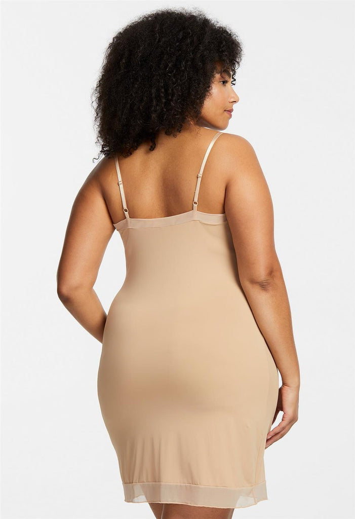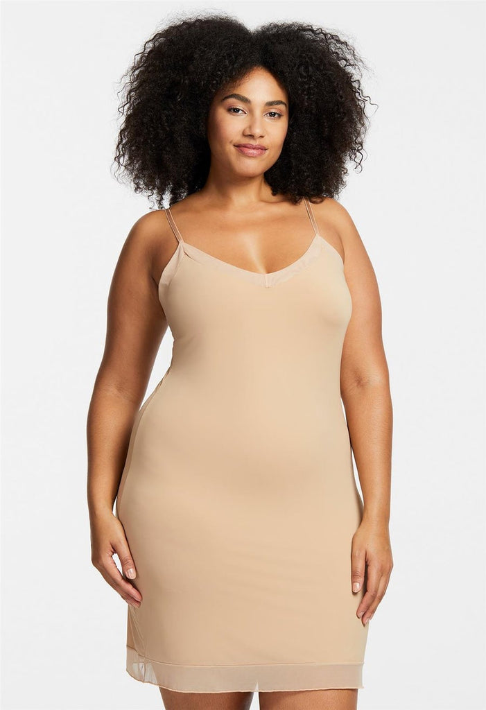 This soft and light full length slip smooths your silhouette and is easy to wear. Above the knee with adjustable straps and mesh details.