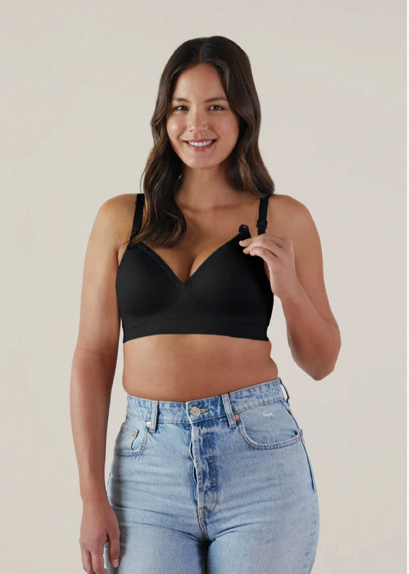 The Plunge Nursing Bra is a sleek, structured, wire-free design that is molded from our popular Muse Bra, and provides a smooth contour without compromising flexibility. With a luxuriously soft, seamless stretch fabric and sewn-in foam cups, this design adjusts to your body and hugs your shape throughout pregnancy and nursing for 24/7, 365 wear. Featuring a low-cut, plunge v-neckline and modern silhouette, it will make you wonder, is this really a nursing bra?