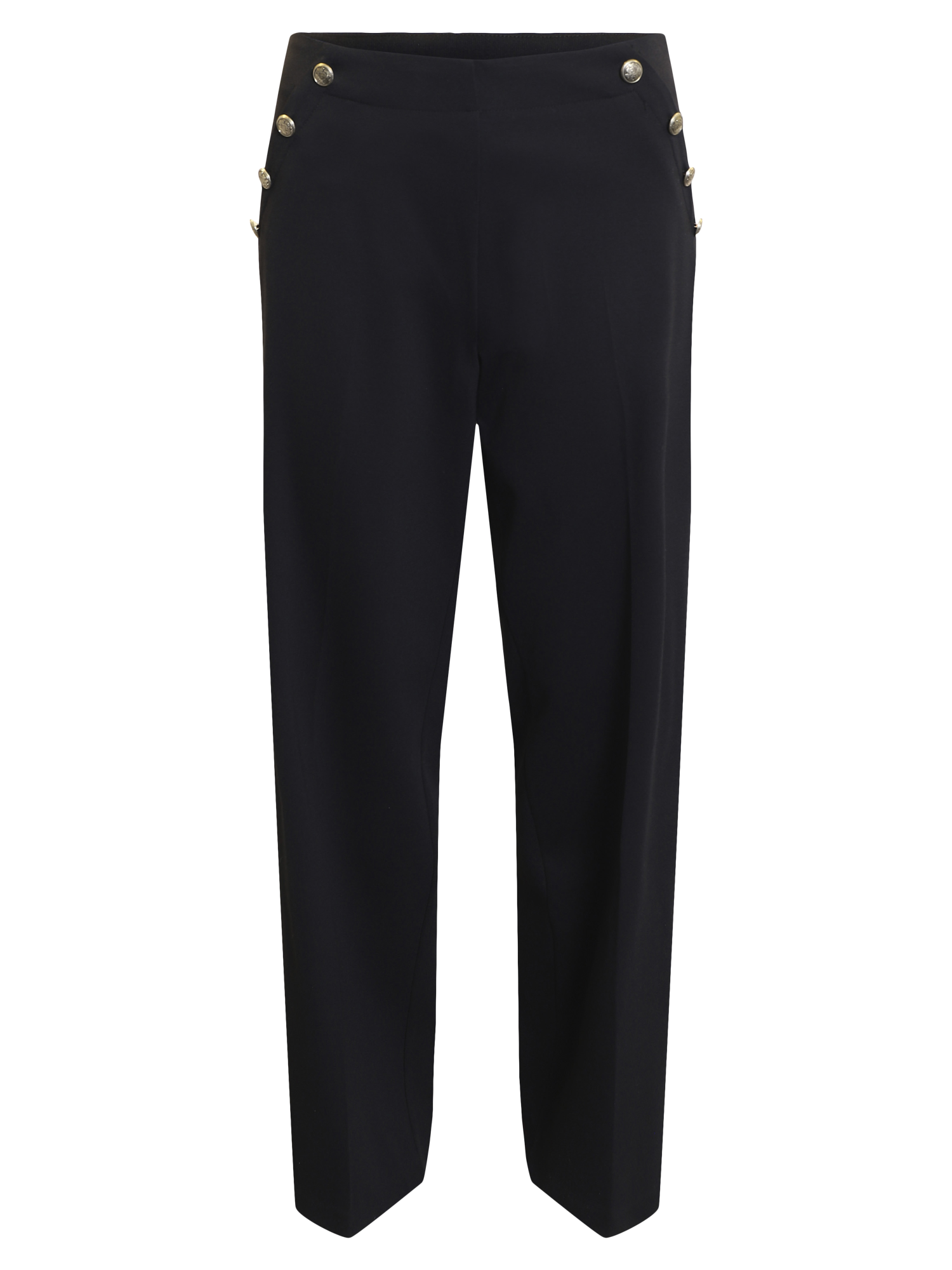 Sleek black knit pants that move with you, featuring practical side pockets and a chic side zipper for easy on-and-off. Gold button accents add a touch of sophistication to this versatile wardrobe essential. Perfect for effortless style that works from day to night.