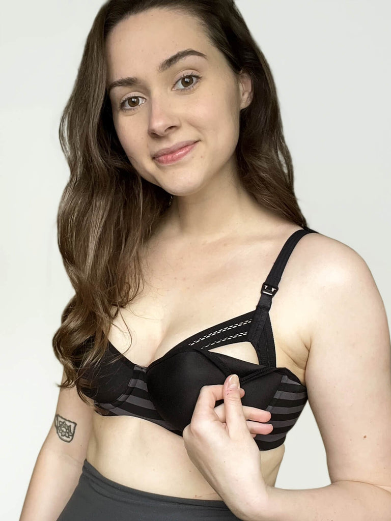 - Easy-feed drop down cups with a delicate lace trim A-frame sling.