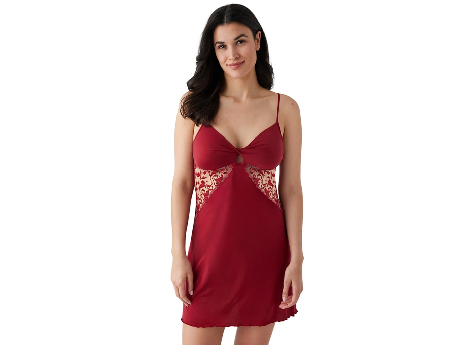 Add some excitement to your lingerie drawer with this soft, stretch chemise, showcasing embroidered mesh sides with metallic details.