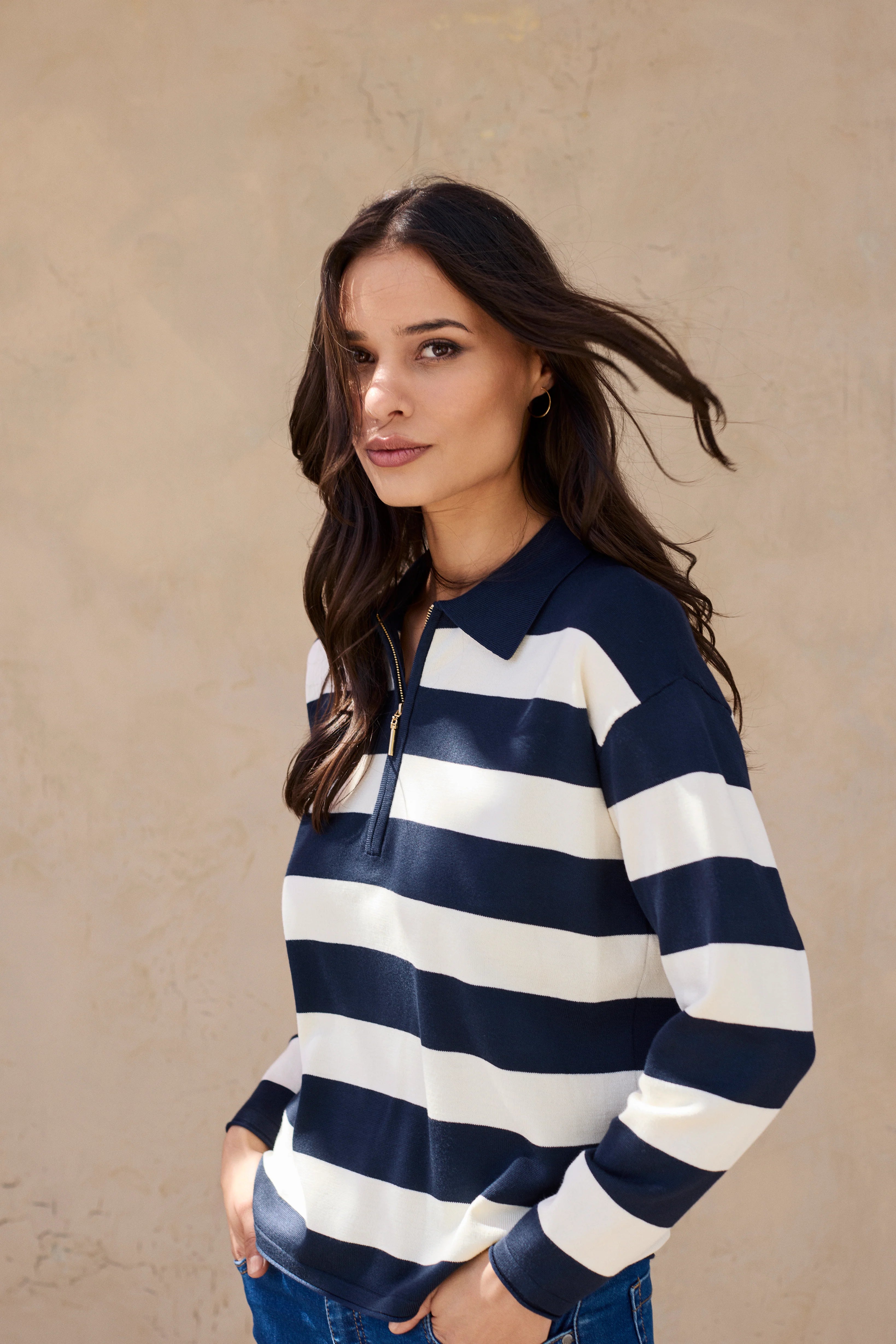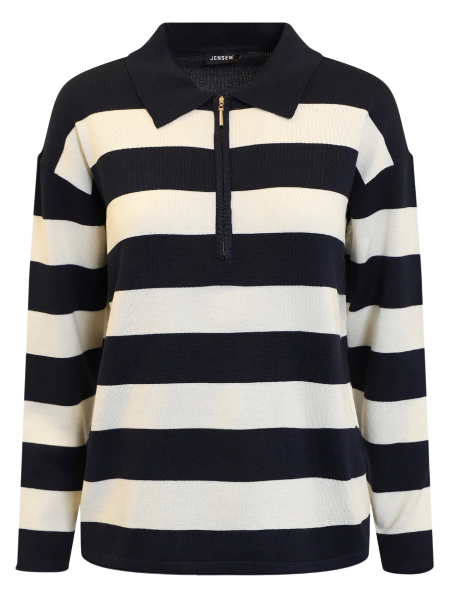 Elevate your casual wardrobe with this charming Jensen polo featuring a bold navy and cream stripe that practically begs for compliments. The quarter-zip design in gleaming gold hardware makes layering effortless, while the soft knit fabric keeps things cozy without the stuffiness. Complete with a classic collar, it's the kind of piece that works equally well for weekend adventures or relaxed office vibes. Versatile, comfortable, and undeniably stylish.