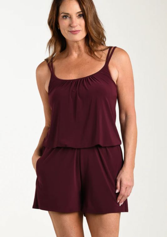 Perfect for summertime, this swim romper/cover-up by Maxine of Hollywood is sleek and chic. A gathered waist is flattering, while adjustable straps accommodate your perfect fit.
