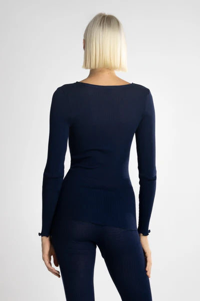 Women's long-sleeved shirt made from a blend of wool (70%) and silk (30%), an ideal combination for a versatile and refined garment. The rib-knit fabric is designed to adhere smoothly to your body, creating a "second skin" effect that ensures comfort and warmth without weighing you down. Wool provides you with excellent thermal regulation, retaining warmth on cold days and promoting the skin's natural perspiration. Silk, on the other hand, adds softness and a slight sheen to the fabric, making the women's top feel pleasant against the skin. The finished hem adds a touch of elegance, while the absence of side seams prevents any irritation, making this long-sleeved top ideal for everyday wear. Perfect as an undergarment for winter or as an undergarment, this women's top is a must-have for those who appreciate quality and functionality in a winter garment.