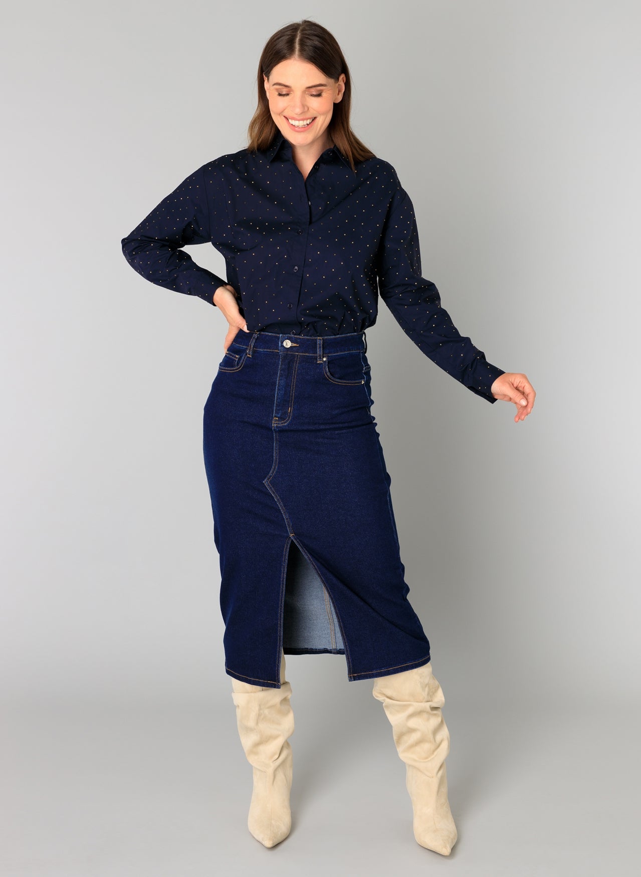 The Yest Blythe Sparkle Top combines classic navy with stylish gold stud accents for a subtle shimmer. Featuring a button-up front and a neat collar, it’s perfect for adding a polished yet playful touch to your everyday look. Comfortable and chic, this top makes dressing up effortless and fun.